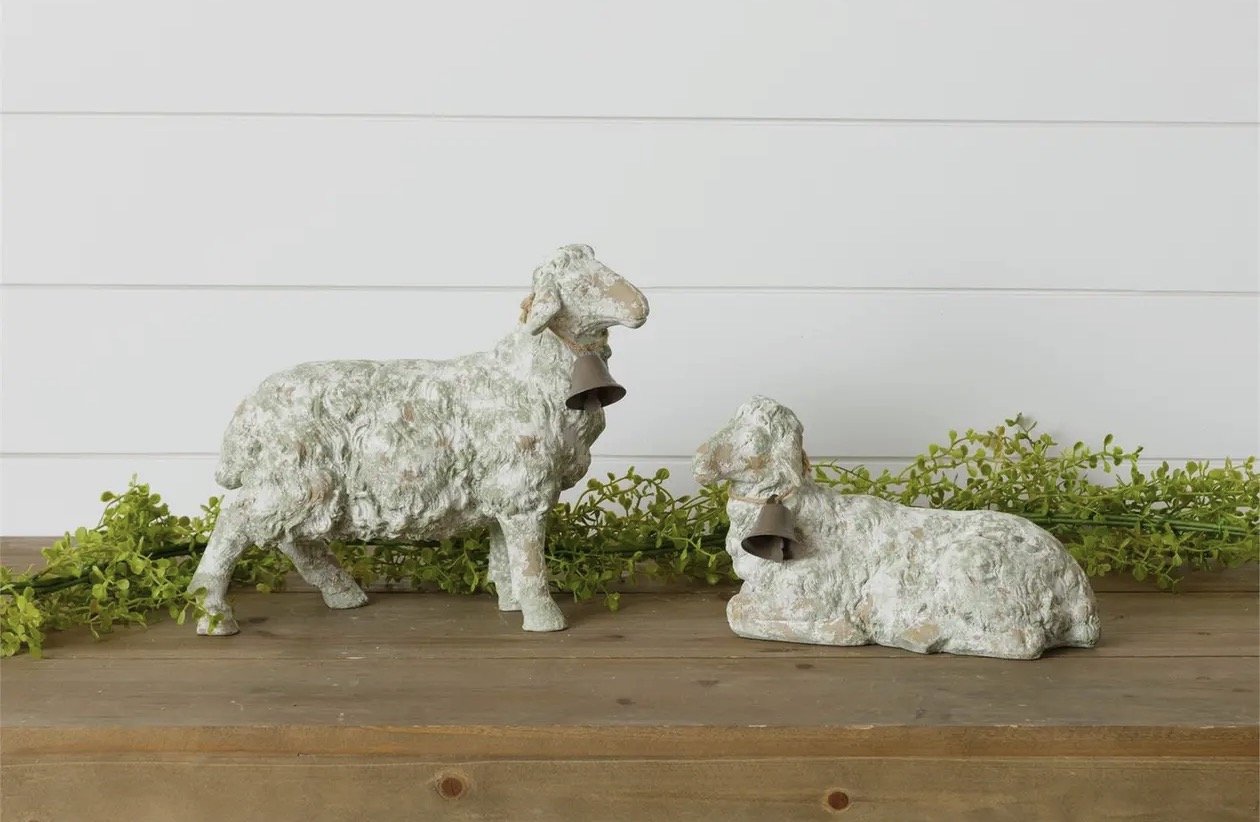 This charming set of two distressed farmhouse lambs with bells is perfect for spring decorating, Easter displays, or adding a soft rustic touch to your home.